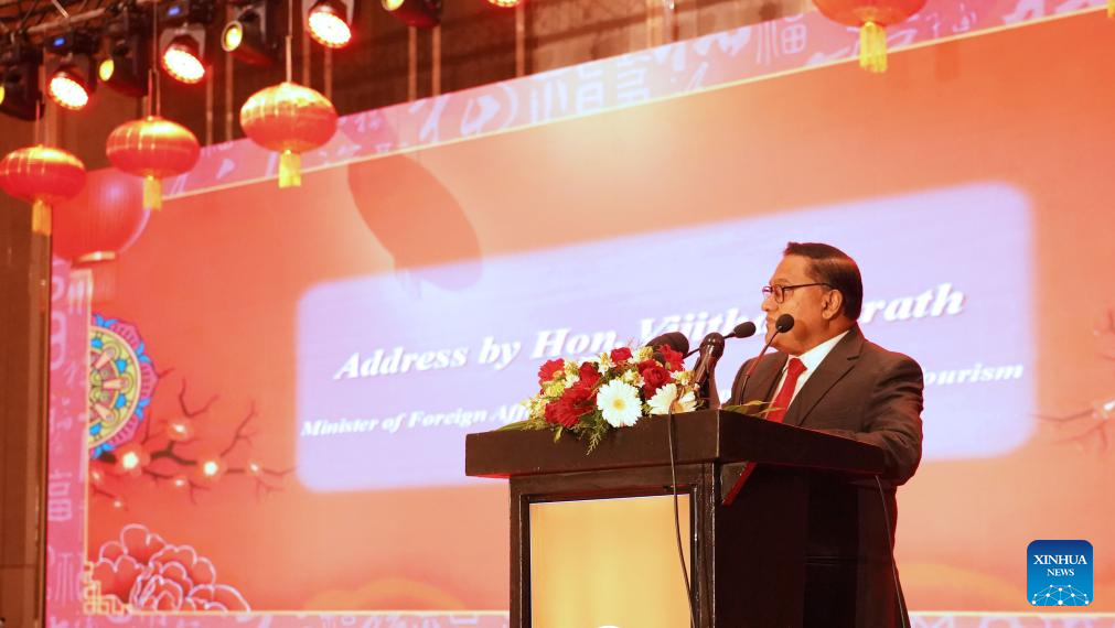 Sri Lankan Foreign Minister Vijitha Herath delivers a speech at a Chinese New Year reception in Colombo, Sri Lanka, Feb. 9, 2026. (Xinhua/Wu Ziyu)