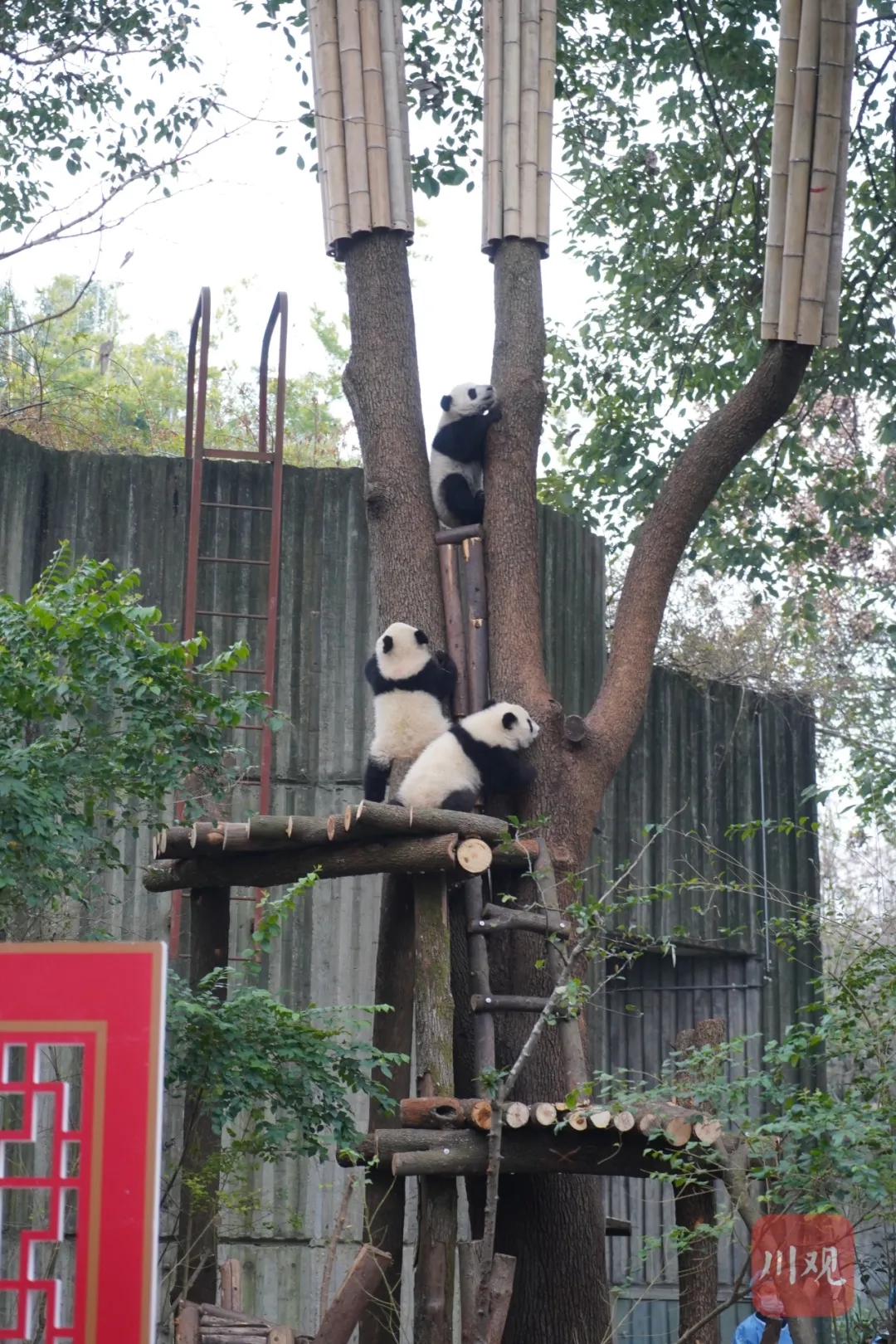 Giant panda cubs climb trees at the Chengdu Research Base of Giant Panda Breeding in Chengdu, capital of southwest China's Sichuan Province. (Photo/Sichuan Daily)