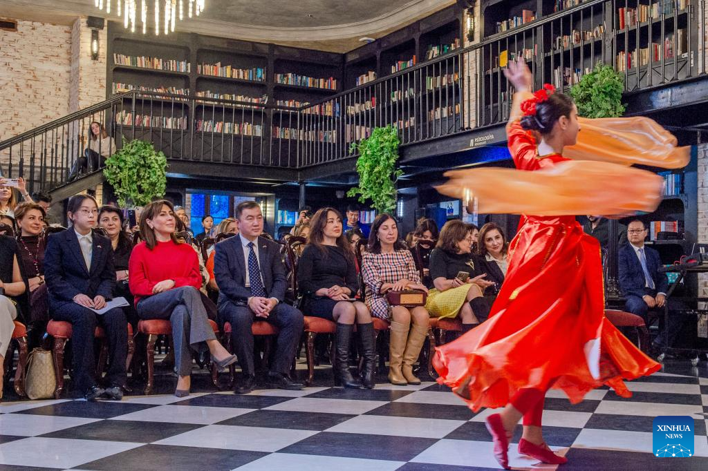A student from the Confucius Institute at Azerbaijan University of Languages performs Xinjiang dance during a Chinese New Year cultural event at Baku Book Center in Baku, Azerbaijan, Feb. 11, 2026. The Confucius Institute at Azerbaijan University of Languages hosted a Chinese New Year cultural event here on Wednesday. Over 80 local audience joined students from the institute as well as representatives of Chinese-funded enterprises to enjoy performances including classical Chinese poetry recitations, classic Chinese songs, Chinese folk-style dances, and Peking Opera excerpts. (Xinhua/Chen Junfeng)