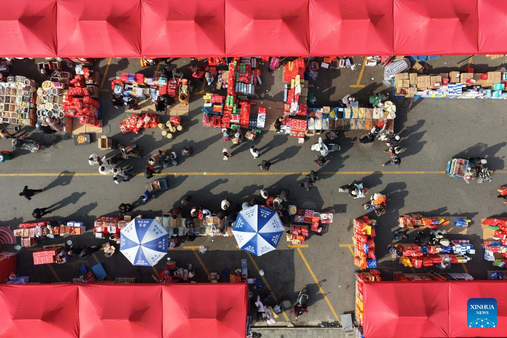 This aerial drone photo shows people purchasing goods needed for the Chinese New Year celebrations at a market in Yinji Township of Huai'an City, east China's Jiangsu Province, Feb. 13, 2026. Markets across the country are bustling nowadays as people flock there to stock up on goods in preparation for the upcoming Spring Festival, or the Chinese New Year. (Photo by Yang Yugang/Xinhua)