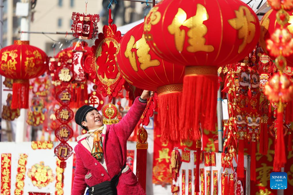 A girl selects Chinese New Year decorations at a market in Tancheng County of Linyi City, east China's Shandong Province, Feb. 13, 2026. Markets across the country are bustling nowadays as people flock there to stock up on goods in preparation for the upcoming Spring Festival, or the Chinese New Year. (Photo by Zhang Chunlei/Xinhua)