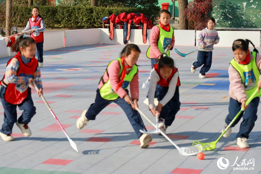 Students compete in a simulated floorball match on the playground of Sanhetou Primary School, Chenqiao town, Fengqiu county, central China's Henan Province. (People's Daily Online/Cheng Minghui)