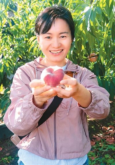 Yue Qiaoyun shows a Pinggu peach in Pinggu district, Beijing. (Photo courtesy of Yue Qiaoyun)
