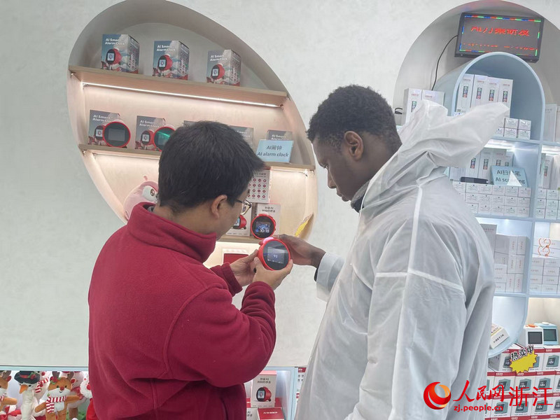 A foreign businessman learns about an AI alarm clock at the Yiwu International Trade Market in Yiwu, east China's Zhejiang Province. (People's Daily Online/Wang Liwei)