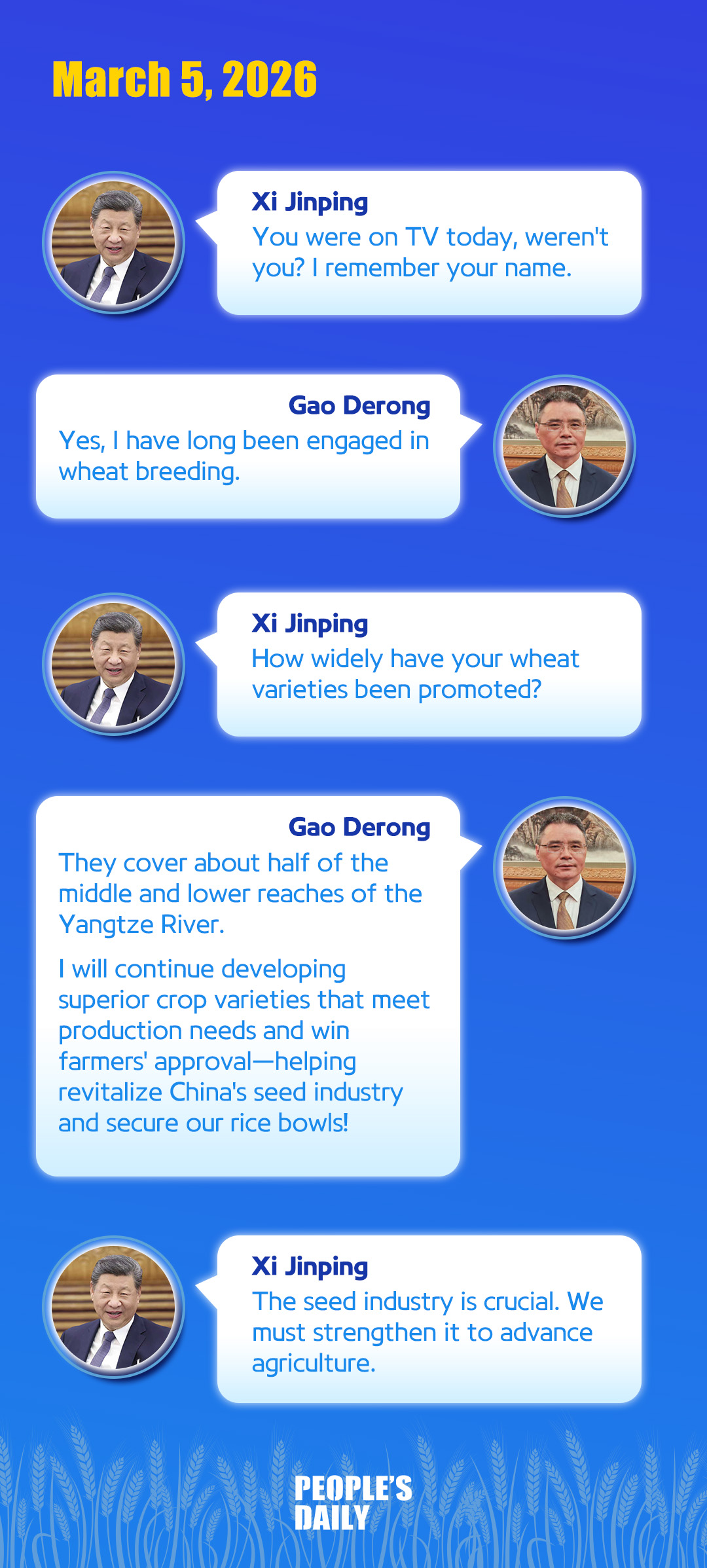 Earlier that morning, Gao had spoken about his over 30 years of dedication to wheat breeding during a group interview at the Deputies' Corridor, which was broadcast live on China Central Television.
