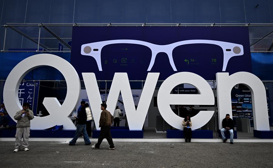 People walk past the booth of Qwen during the 2026 Mobile World Congress (MWC) in Barcelona, Spain, March 2, 2026. (Xinhua/Cheng Min)