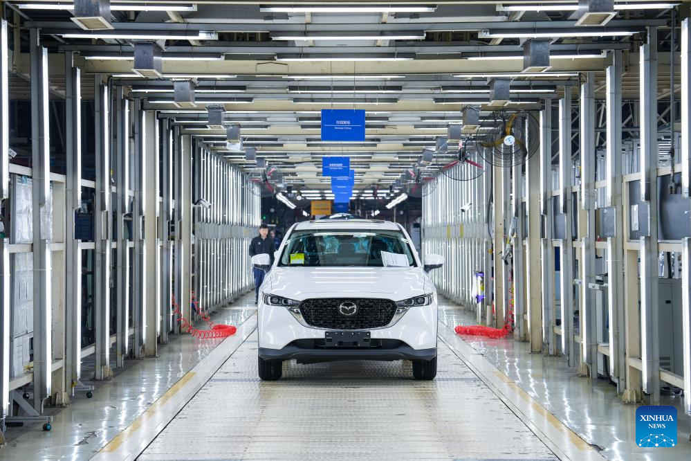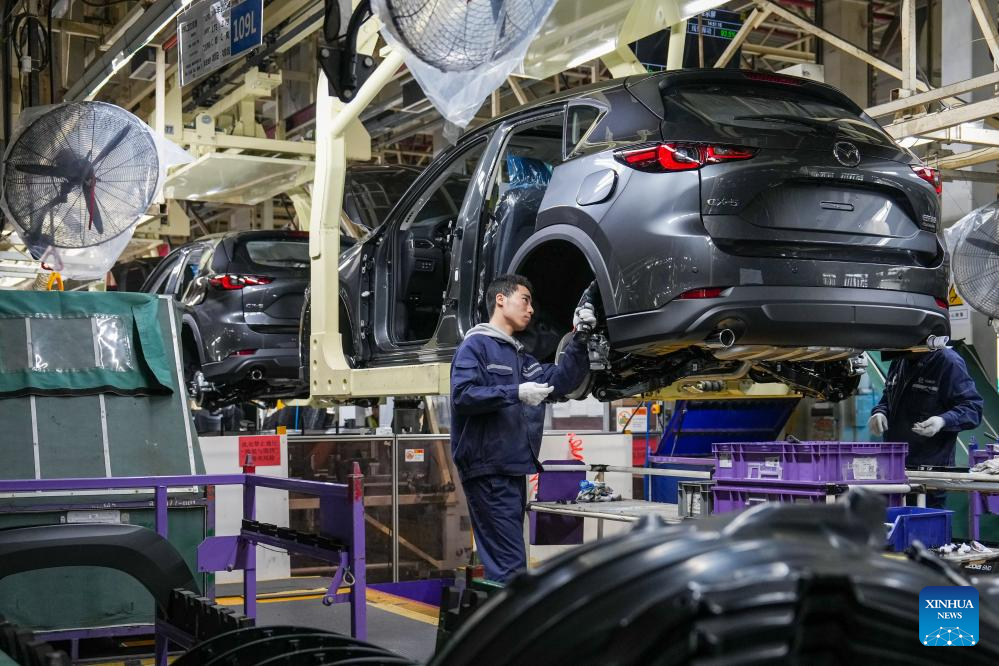 Staff members work on a production line at a workshop of Changan Mazda in Nanjing, east China's Jiangsu Province, March 17, 2026. In recent years, Jiangsu, a key automotive manufacturing hub in China, has accelerated its automotive industry growth by closely coordinating vehicle manufacturers and auto part suppliers.
