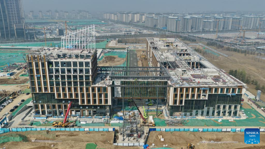 An aerial drone photo taken on March 25, 2026 shows staff members of China Construction Third Engineering Bureau Group Co., Ltd. working at the construction site of the headquarters of China Mineral Resources Group Ltd. in Xiong'an New Area, north China's Hebei Province.