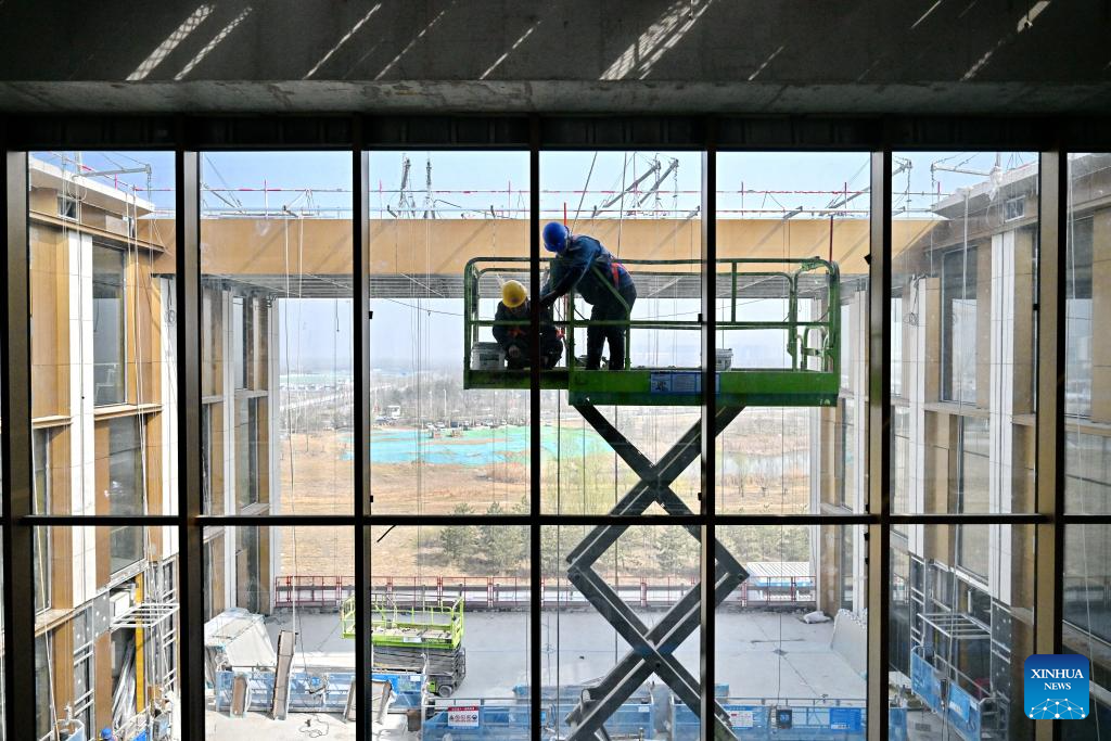 Staff members of China Construction Third Engineering Bureau Group Co., Ltd. work at the construction site of the headquarters of China Mineral Resources Group Ltd. in Xiong'an New Area, north China's Hebei Province, March 25, 2026.