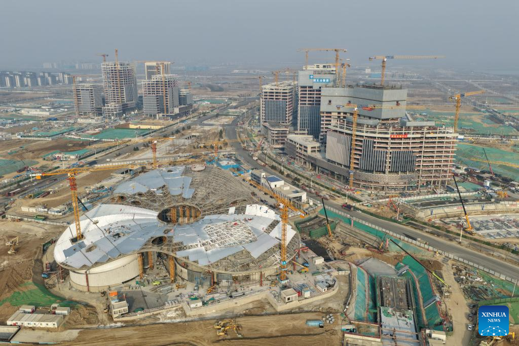 An aerial drone photo taken on March 25, 2026 shows a scene at the construction site of an urban cultural square in Xiong'an New Area, north China's Hebei Province.