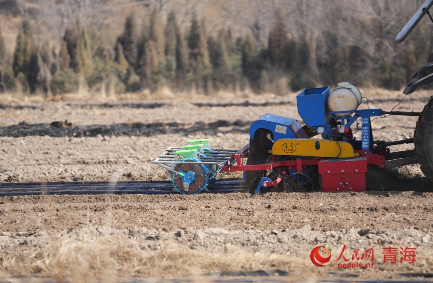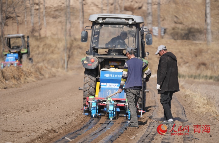 An agricultural machine equipped with BeiDou Navigation Satellite System sows seeds in Xiliangqi village, Xibao town, Huangzhong district, Xining city, northwest China's Qinghai Province. (People's Daily Online/Gan Haiqiong)