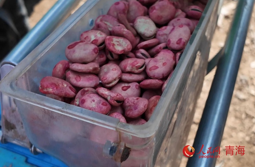 Photo shows broad bean seeds treated with seed-coating technology in Xiliangqi village, Xibao town, Huangzhong district, Xining city, northwest China's Qinghai Province. (People's Daily Online/Gan Haiqiong)