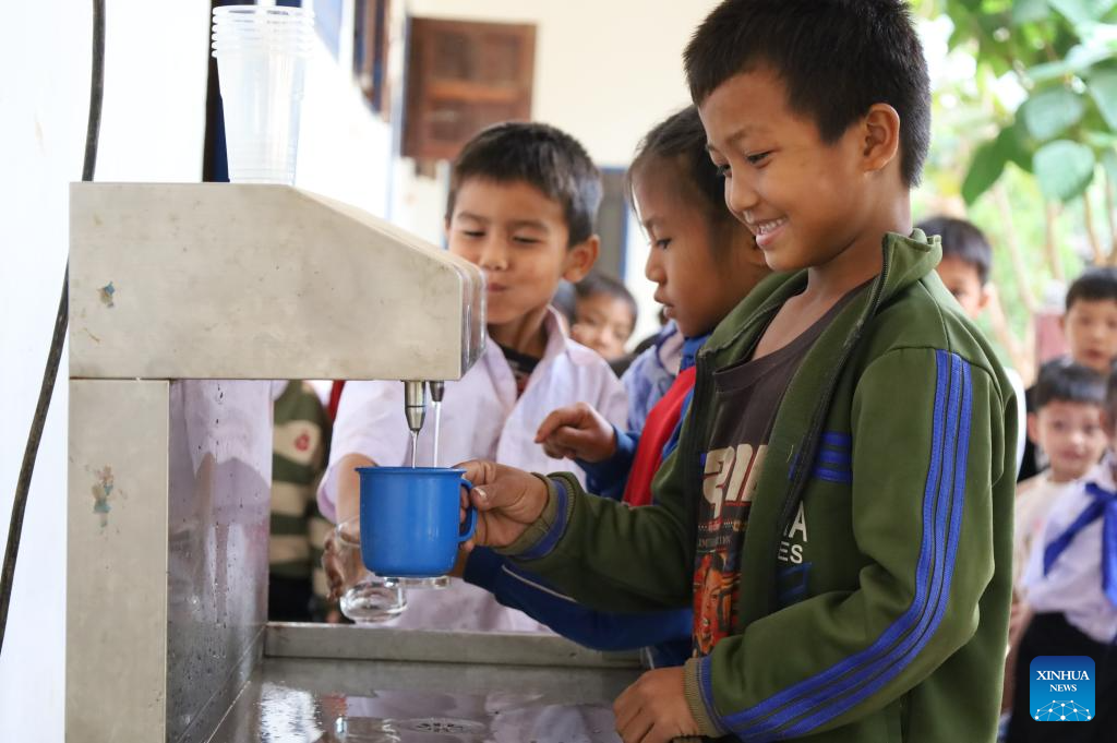 Students get drinking water at a primary school of Hatkeep Village, northern Laos' Luang Prabang Province, March 11, 2026. (Xinhua/Ma Huaizhao)