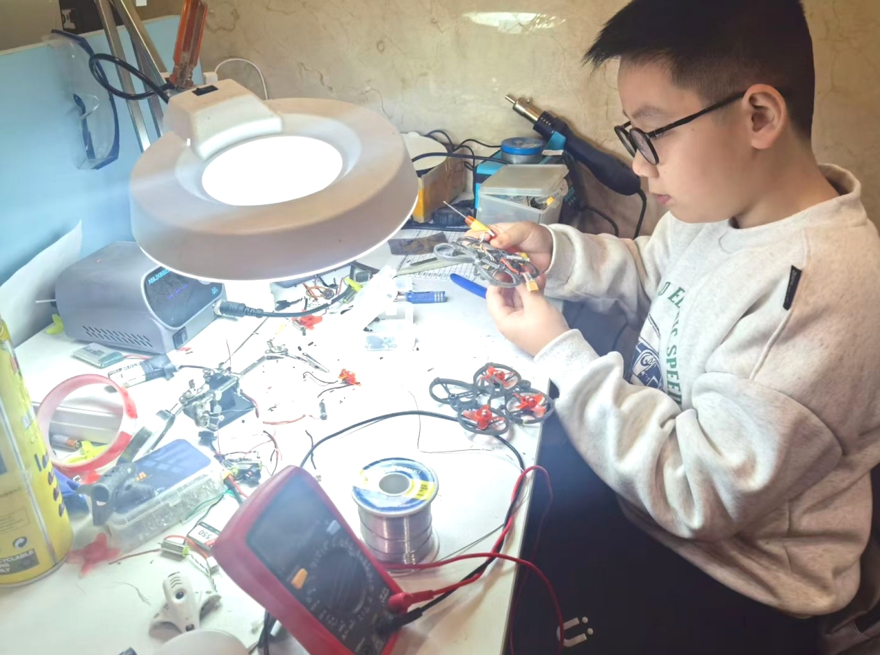 A young enthusiast for drone soccer repairs a drone. (Photo from the official account of the publicity department of Zhanjiang on WeChat)