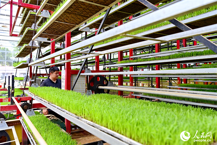 Tech-savvy farmers calibrate multi-layered vertical racks that can rotate 360 degrees at a rice seedling factory in Hengshi town, Nankang district, Ganzhou, east China's Jiangxi Province. (People's Daily Online/Zhu Haipeng)