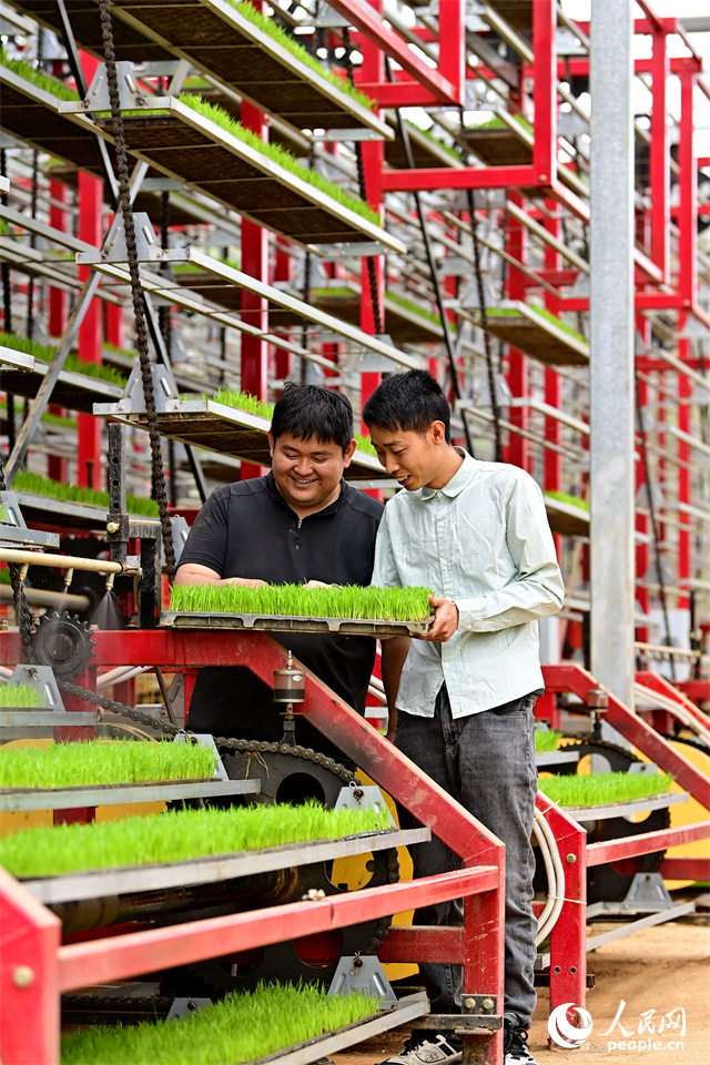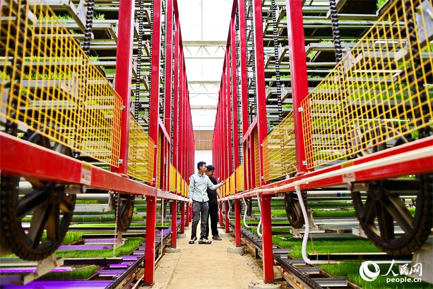 At a rice seedling factory in Hengshi town, Nankang district, Ganzhou, east China's Jiangxi Province, tech-savvy farmers monitor the growth of rice seedlings cultivated on multi-layered, 360-degree rotating racks.