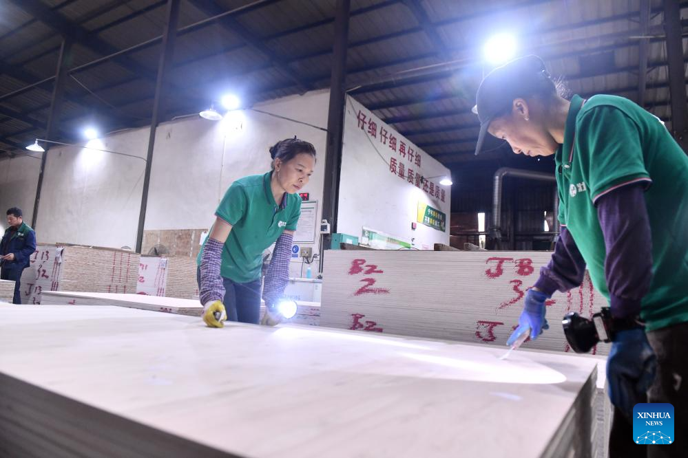 A worker works at a board production factory in Rong'an County of Liuzhou City, south China's Guangxi Zhuang Autonomous Region, April 1, 2026. In recent years, Rong'an County has leveraged its high-quality resources of Chinese fir to drive rural revitalization. Through integrating seedling cultivation, planting, timber processing and rural tourism, the Chinese fir-related industry has emerged as a pillar sector in Rong'an, creating more than 20,000 jobs for local residents. (Xinhua/Huang Xiaobang)