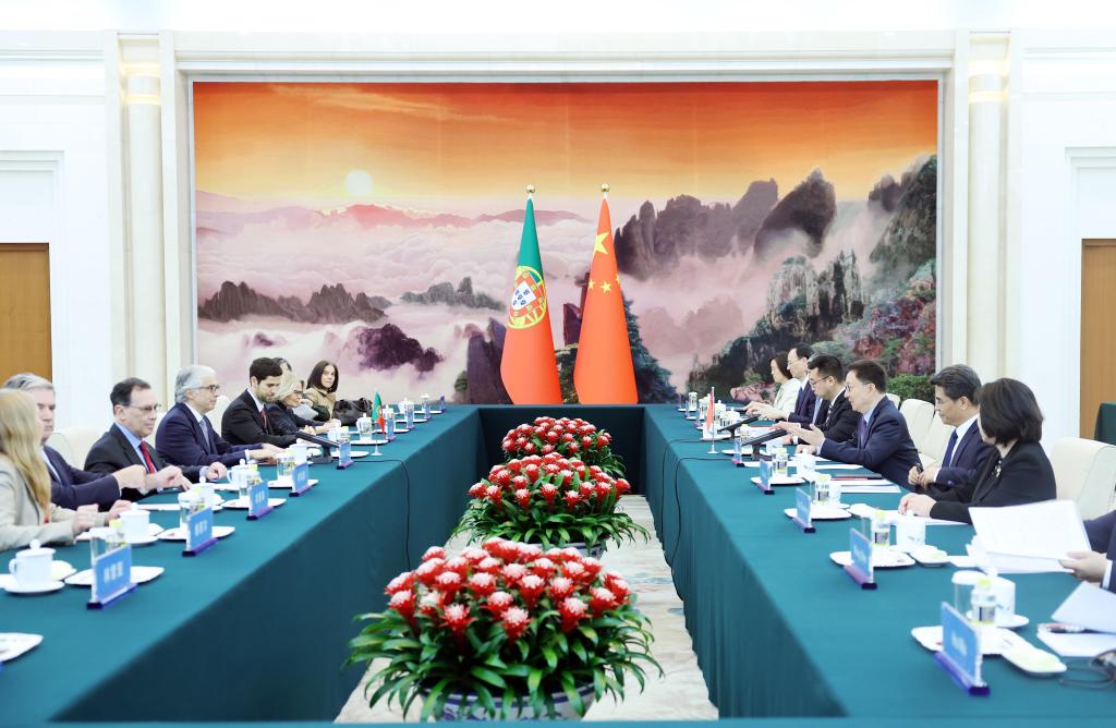 Chinese Vice President Han Zheng meets with Jose Pedro Aguiar-Branco, speaker of the Portuguese parliament, in Beijing, capital of China, April 8, 2026. (Xinhua/Yao Dawei)