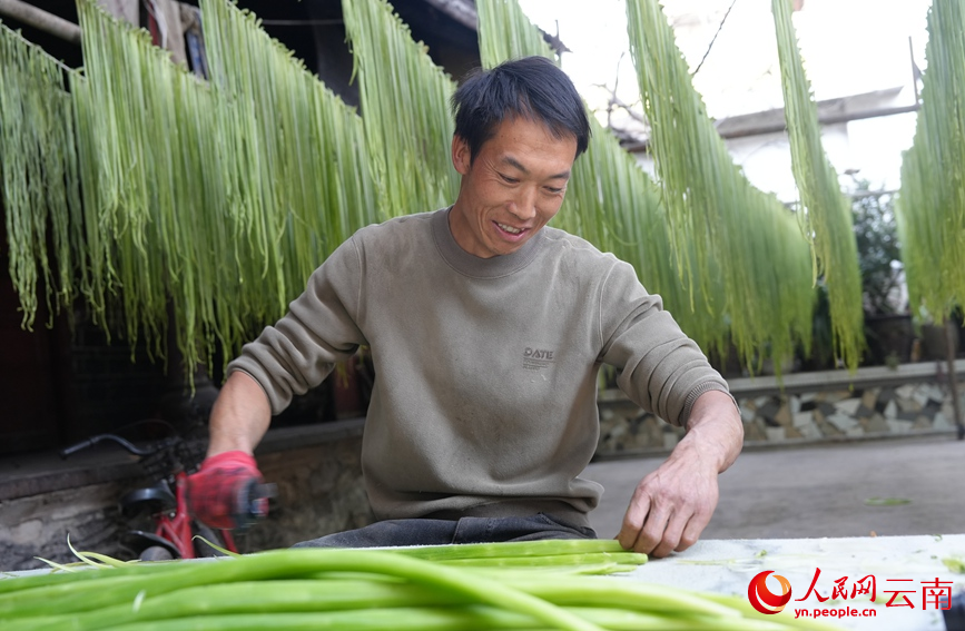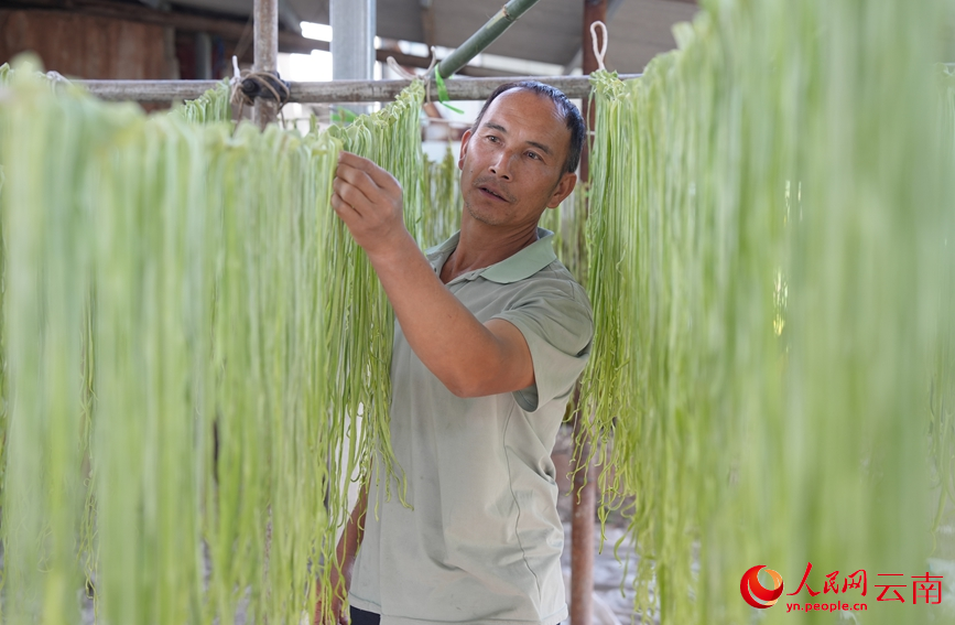 Huang Yanhua, a villager, checks dried Gong Cai, a vegetable of the lettuce family, in Sangbulao village, Yangjiang town, Yangbi Yi Autonomous County, southwest China's Yunnan Province. (People's Daily Online/Hu Zunhui)