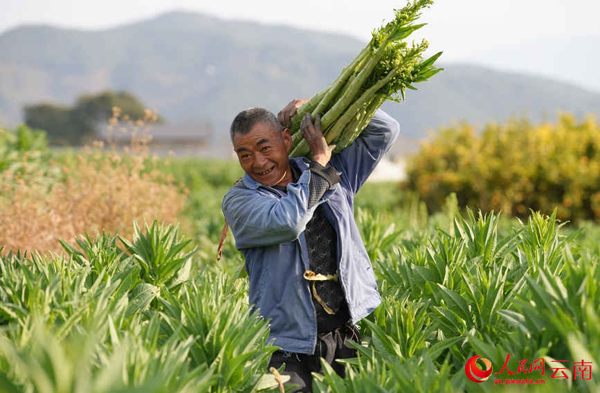 This year, Huang Yanhua, a villager, planted 8 mu (0.53 hectares) of Gong Cai, a vegetable of the lettuce family, in Sangbulao village, Yangjiang town, Yangbi Yi Autonomous County, southwest China's Yunnan Province. He expects to earn more than 60,000 yuan ($8,700) from the crop.