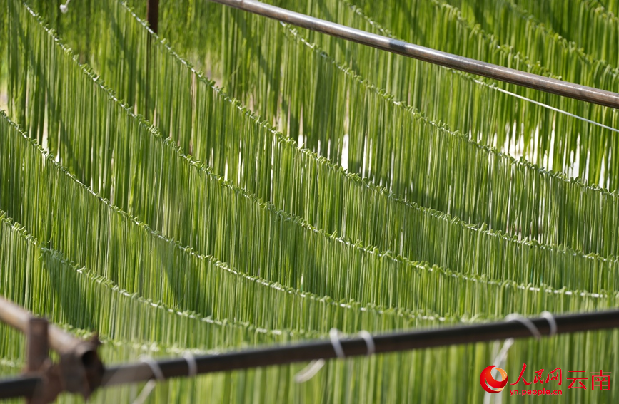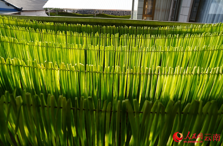 Freshly peeled and sliced Gong Cai, a vegetable of the lettuce family, dries at a villager's home in Sangbulao village, Yangjiang town, Yangbi Yi Autonomous County, southwest China's Yunnan Province. (People's Daily Online/Hu Zunhui)