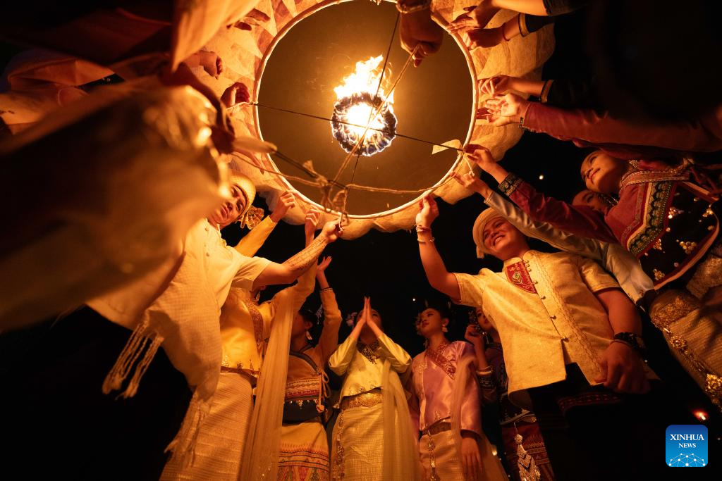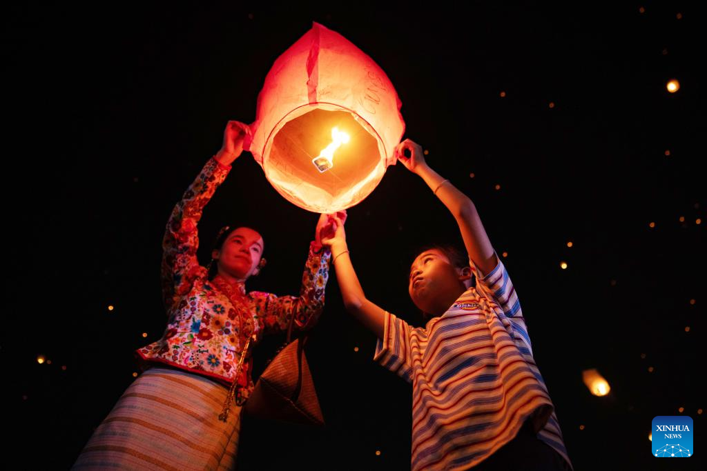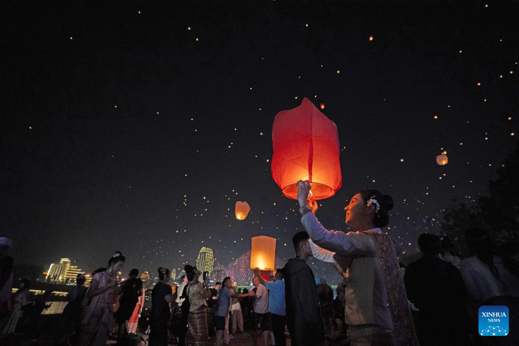 People fly Kongming lanterns, a kind of small hot-air paper balloon, by the Lancang River in Jinghong City, Xishuangbanna Dai Autonomous Prefecture, southwest China's Yunnan Province, April 13, 2026. (Xinhua/Jiang Wenyao)