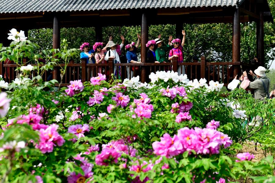 Visitors pose for photos at a peony garden in Heze City, east China's Shandong Province, April 8, 2025. (Xinhua/Guo Xulei)