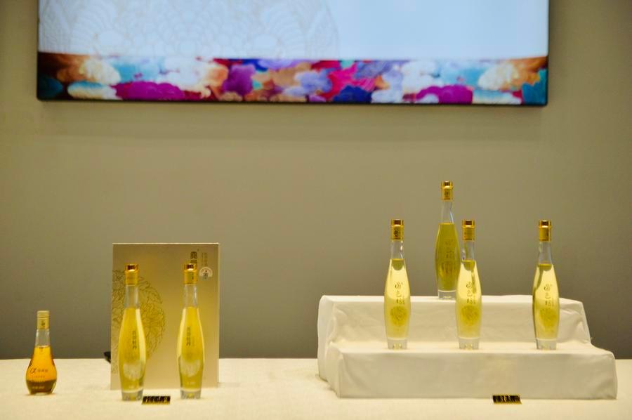 This photo taken on July 9, 2025 shows peony seed oil products displayed at a local company's exhibition hall in Heze City, east China's Shandong Province. (Xinhua/Cui Bowen)