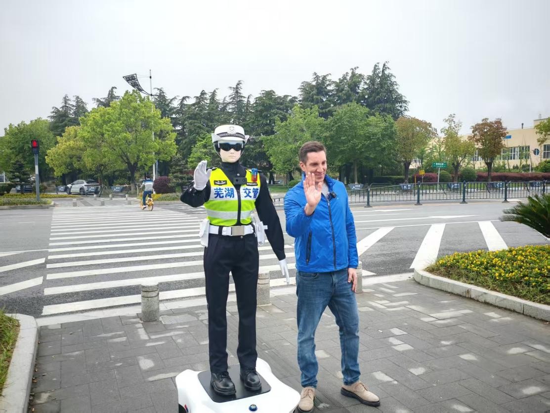 Photo taken on April 14, 2026, shows Alvaro Lago taking a photo with a robot traffic cop in Wuhu, east China's Anhui Province. (People's Daily Online/Zhang Kaiwei)