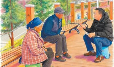 Yan Fei (right) talks with villagers in Huopu village, Zhaojue county, Liangshan Yi Autonomous Prefecture, southwest China's Sichuan Province. (Photo taken by Zhang Qie'er, transformed into a drawing using AI)