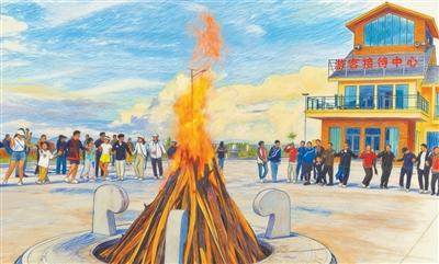 A torch festival is held in Huopu village, Zhaojue county, Liangshan Yi Autonomous Prefecture, southwest China's Sichuan Province. (Photo taken by Zhang Qie'er, transformed into a drawing using AI)
