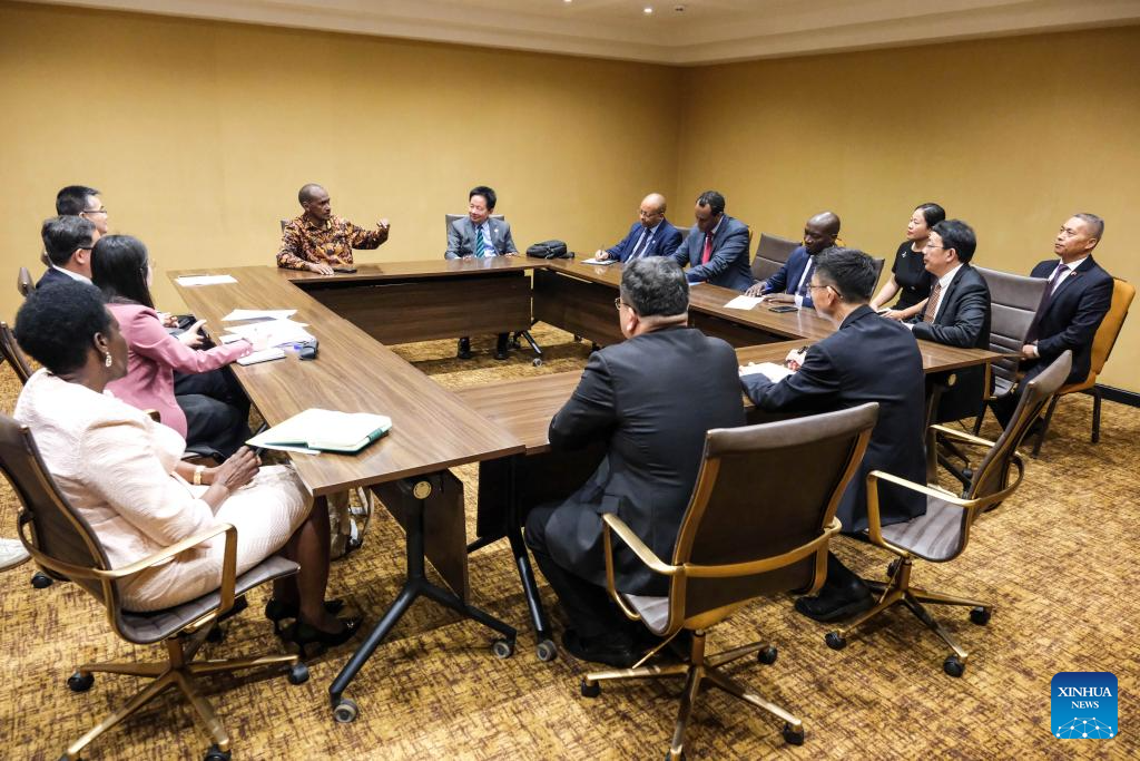 Officials from Food and Agriculture Organization of the United Nations (FAO), Chinese and Ugandan government talk at a trilateral side meeting during the conclusion event of the FAO-China-Uganda South-South Cooperation Phase III project held in Kampala, Uganda, April 16, 2026. (Photo by Hajarah Nalwadda/Xinhua)
