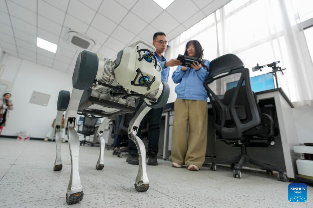 Technicians test a robot dog used for quality control in railway logistics at an experimental base of China Railway Harbin Group of Technology Corp. in Harbin, northeast China's Heilongjiang Province, April 15, 2026.