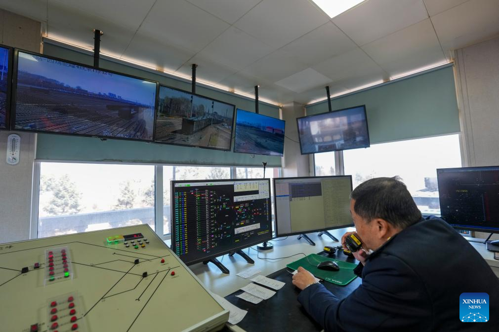 A staff member uses an intelligent control system to carry out freight train marshalling operations at Harbin South Railway Station in Harbin, northeast China's Heilongjiang Province, April 15, 2026.