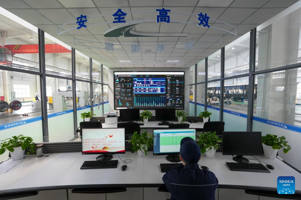 A technician monitors equipment operating condition on a digital intelligent control system at a workshop of China Railway Harbin Bureau Group Co., Ltd. in Harbin, northeast China's Heilongjiang Province, April 15, 2026.