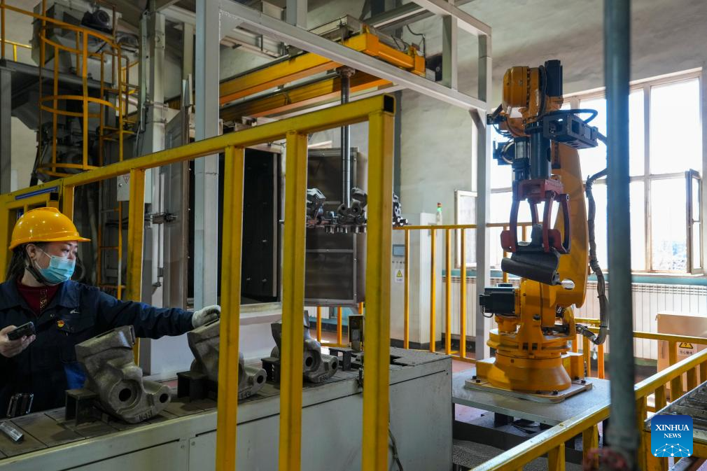 A robot conducts maintenance work at a workshop of China Railway Harbin Bureau Group Co., Ltd. in Harbin, northeast China's Heilongjiang Province, April 15, 2026.