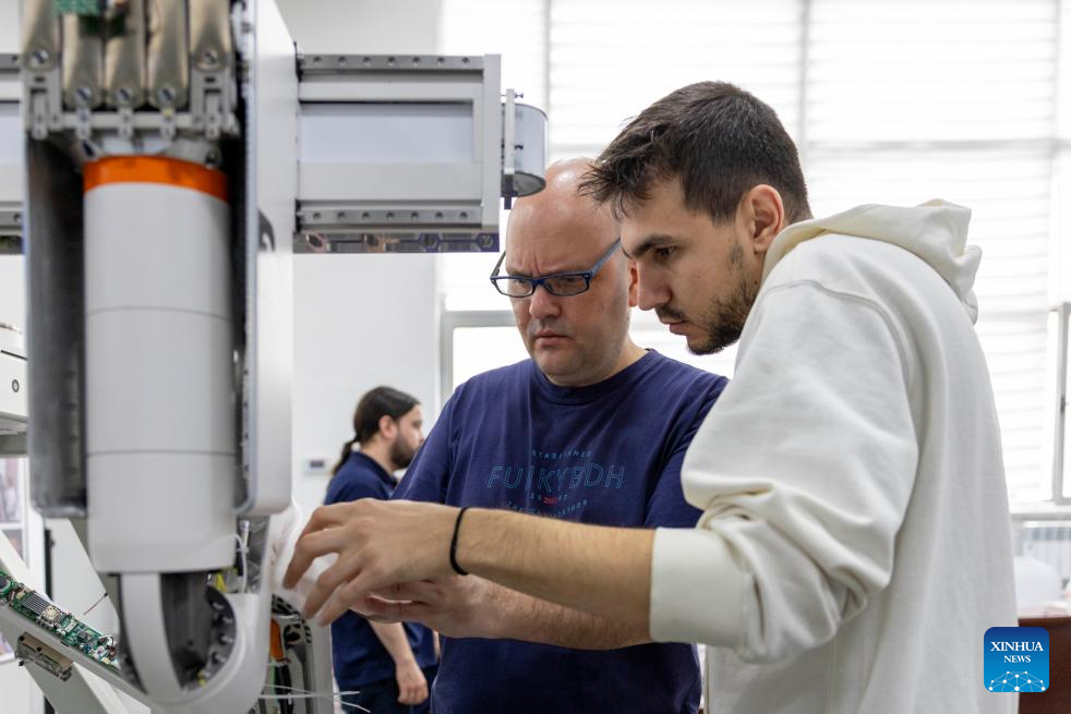 A staff member (R) trains foreign clinical support engineers at the technical service training center of Harbin Sagebot Intelligent Medical Equipment Co., Ltd. in Harbin, northeast China's Heilongjiang Province, April 16, 2026. In recent years, the Harbin-based medical equipment enterprise has been dedicated to the development of high-end medical equipment as well as core technologies in surgical robots. Their robots have performed over 10,000 successful clinical surgeries worldwide, covering key departments including general surgery, urology, gynaecology, and thoracic surgery. (Photo by Liu Yang/Xinhua)