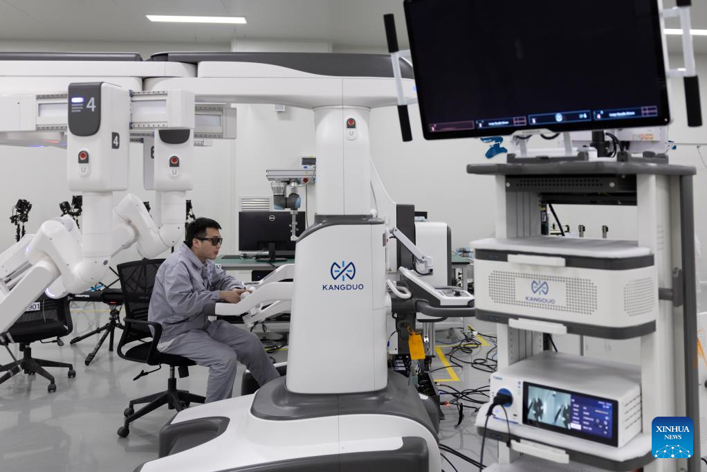 A technician debugs equipment at Harbin Sagebot Intelligent Medical Equipment Co., Ltd. in Harbin, northeast China's Heilongjiang Province, April 16, 2026. In recent years, the Harbin-based medical equipment enterprise has been dedicated to the development of high-end medical equipment as well as core technologies in surgical robots. Their robots have performed over 10,000 successful clinical surgeries worldwide, covering key departments including general surgery, urology, gynaecology, and thoracic surgery. (Xinhua/Zhang Tao)