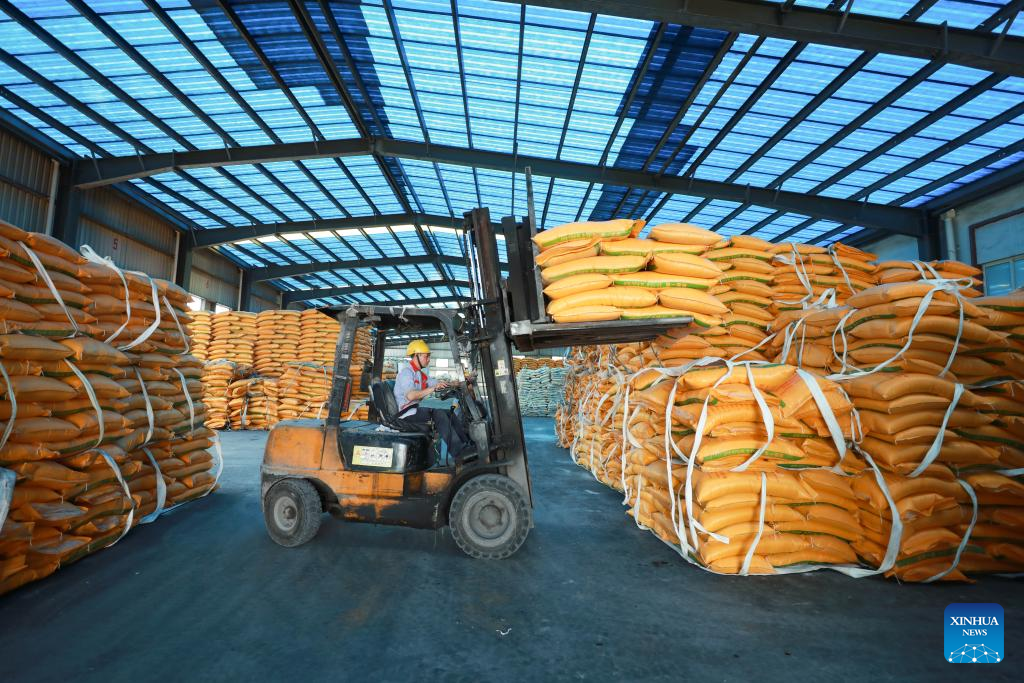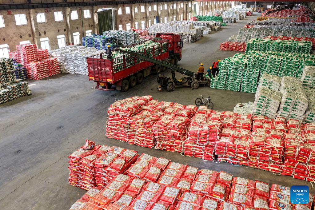 A worker transfers fertilizer at a fertilizer company in Weng'an County, southwest China's Guizhou Province, April 16, 2026.