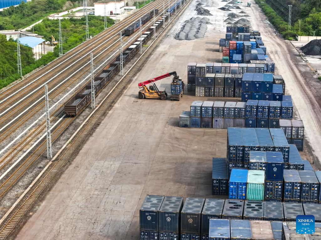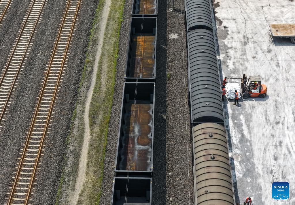 A drone photo taken on April 16, 2026 shows workers transferring raw materials of fertilizer at Weng'an Railway Station on Weng'an-Machangping Railway in Weng'an County, southwest China's Guizhou Province.