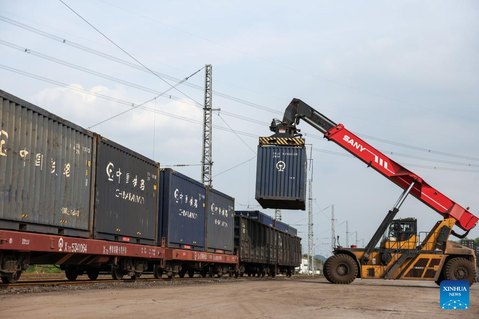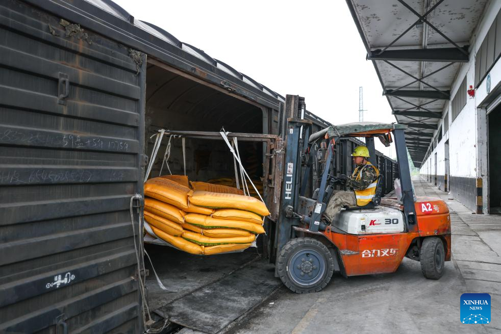A worker loads fertilizer onto a train at Weng'an Railway Station on Weng'an-Machangping Railway in Weng'an County, southwest China's Guizhou Province, April 16, 2026.