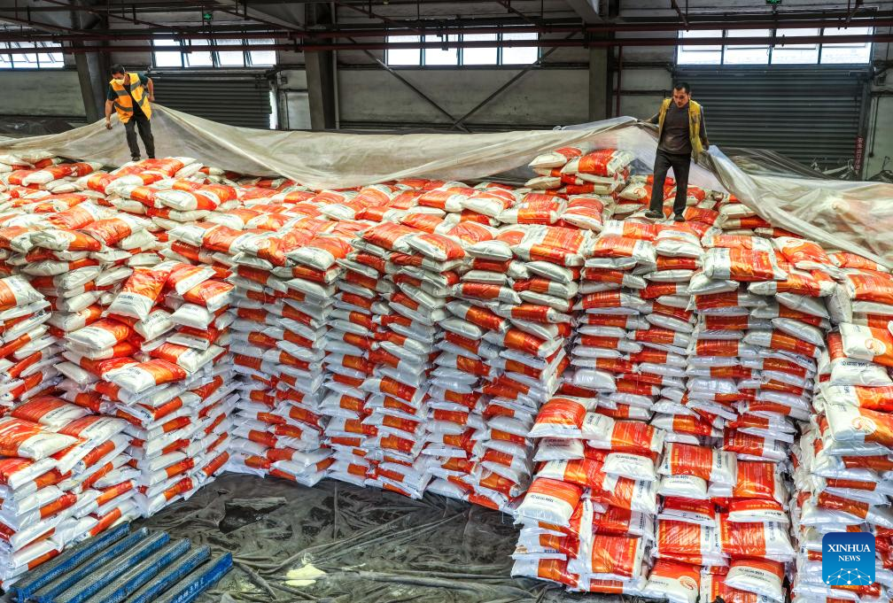 Workers cover fertilizer with films at a store of the Niuchang Railway Station on Weng'an-Machangping Railway in southwest China's Guizhou Province, April 16, 2026.