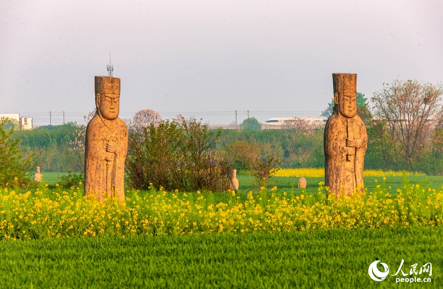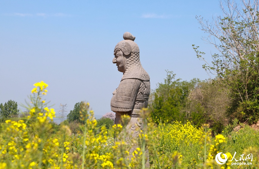 A stone statue of a military official guards a vibrant tapestry of rapeseed flowers in Gongyi city, central China's Henan Province, April 15, 2026. (People's Daily Online/Dai Zexin)