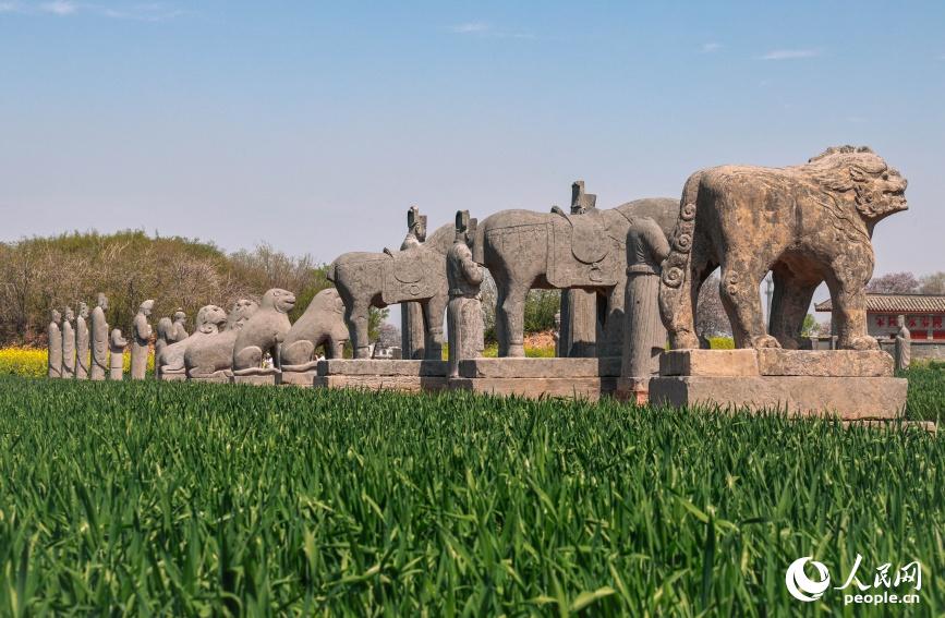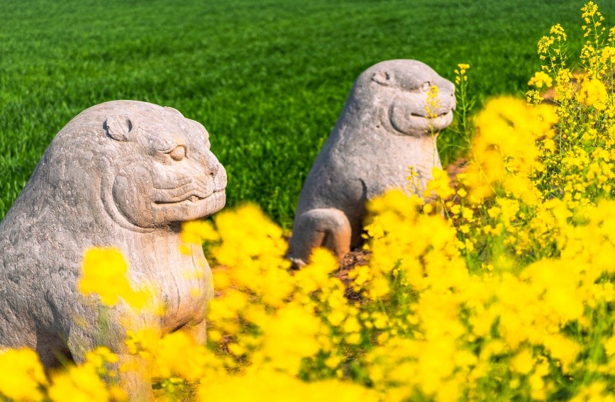 Stone tigers stand amid a vast field of blooming rapeseed flowers in Gongyi city, central China's Henan Province, April 15, 2026. (People's Daily Online/Suo Minjie)