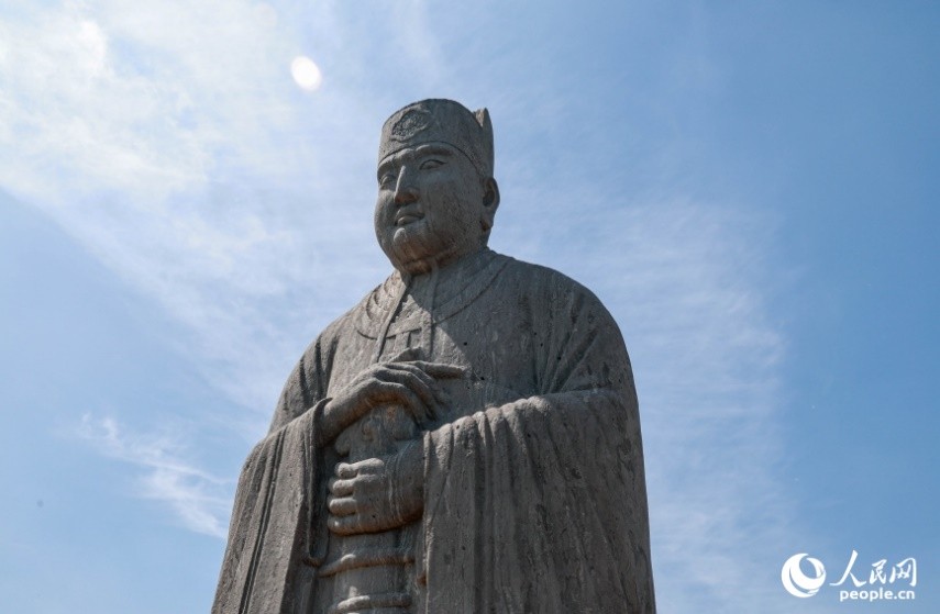 A stone statue of a military official towers over a sprawling wheat field in Gongyi city, central China's Henan Province, April 15, 2026. (People's Daily Online/Chang Liyuan)