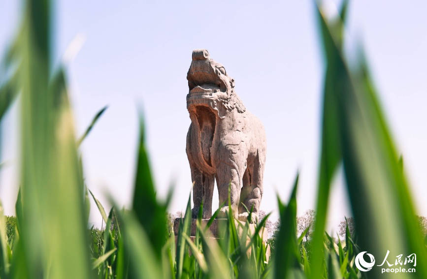 A stone unicorn (luduan) stands amid a sprawling wheat field in Gongyi city, central China's Henan Province, April 15, 2026. (People's Daily Online/Dai Zexin)