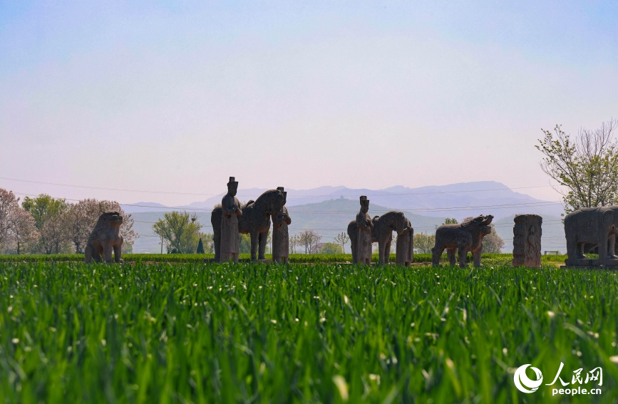 Lush green wheat carpets the landscape surrounding the Northern Song mausoleums in Gongyi city, central China's Henan Province, April 15, 2026. (People's Daily Online/Chang Liyuan)