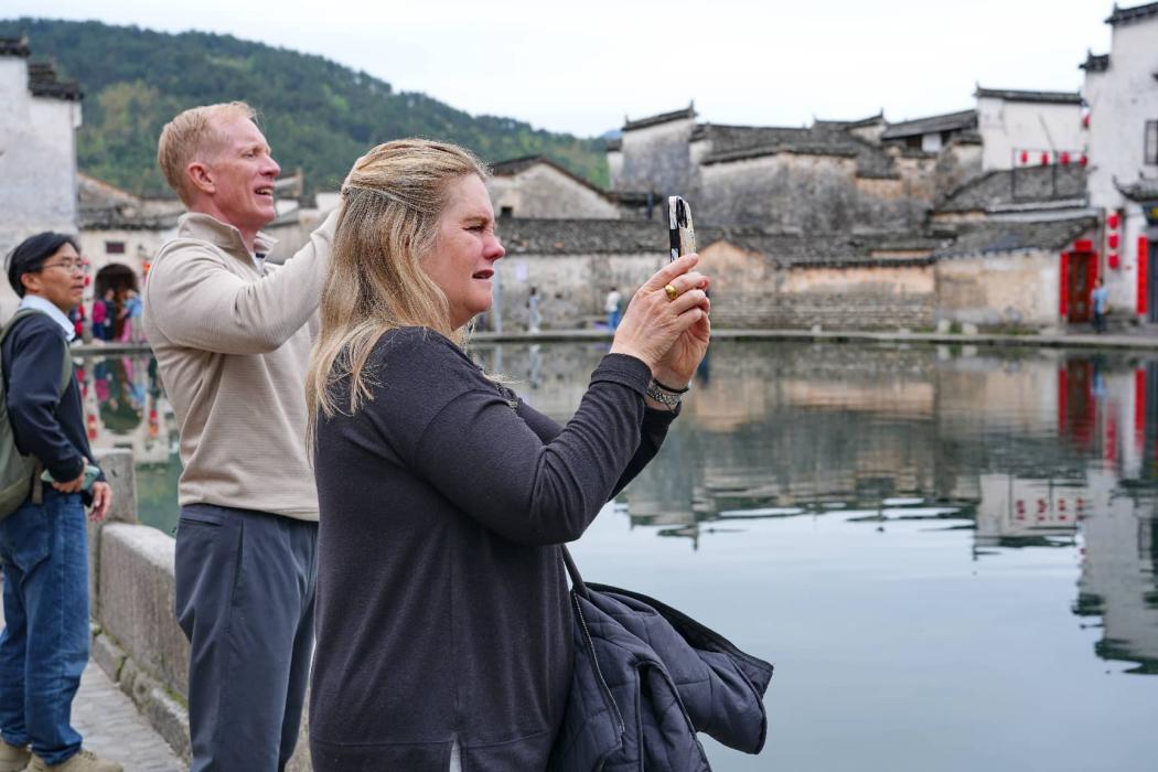 Foreign tourists visit a scenic area in Yixian county, Huangshan, east China's Anhui province. (Photo/Xu Jiadong)