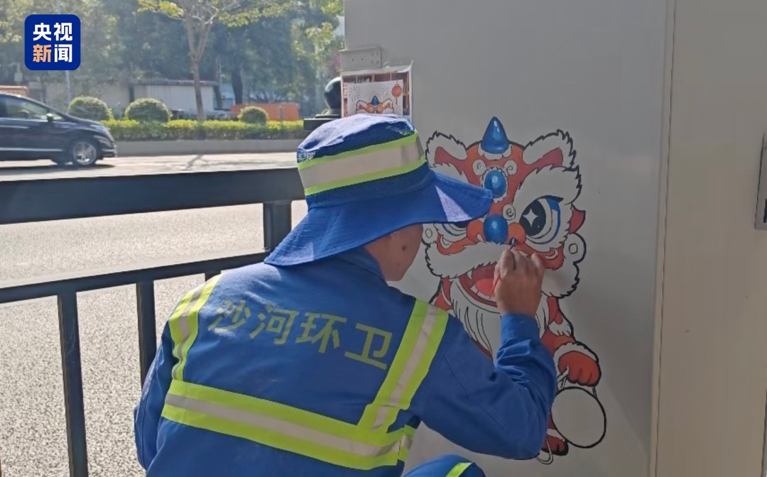 Luo Shiyue, a Chinese sanitation worker, paints on a utility box in Shahe subdistrict, Tianhe district, Guangzhou, south China's Guangdong Province. (Photo from the official account of CCTV News on WeChat)
