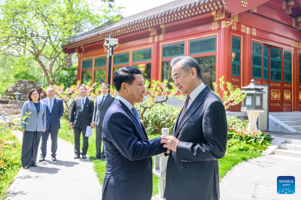 Chinese Foreign Minister Wang Yi, also a member of the Political Bureau of the Communist Party of China Central Committee, meets with Lao Deputy Prime Minister Saleumxay Kommasith, who is visiting China as special envoy of Thongloun Sisoulith, general secretary of the Lao People's Revolutionary Party (LPRP) Central Committee and president of Laos, in Beijing, capital of China, April 21, 2026. (Xinhua/Jin Liangkuai)